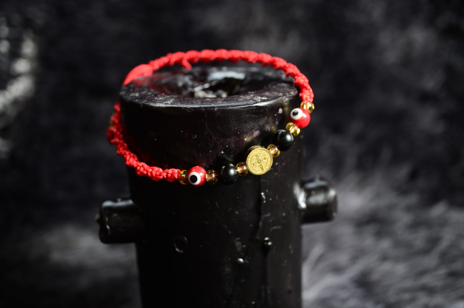 Pulsera tejida a mano con hilo rojo, cuentas de protección en negro y rojo, y medalla dorada de San Benito. Ideal para atraer energía positiva y alejar malas vibras.